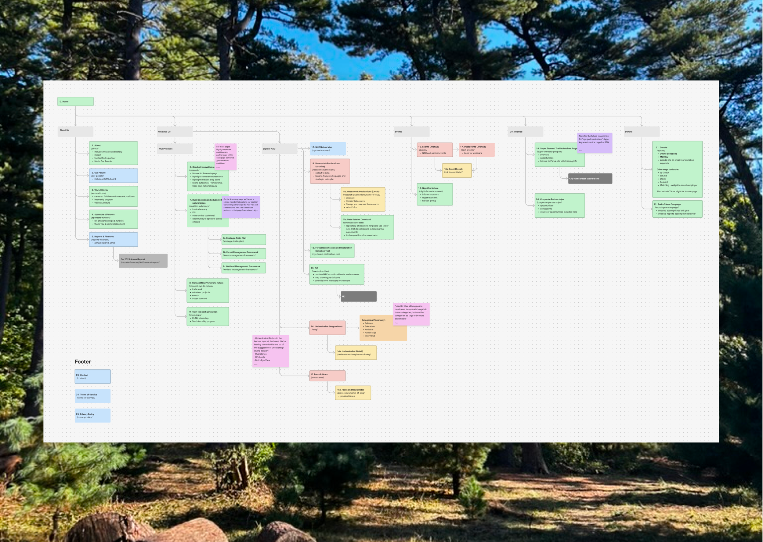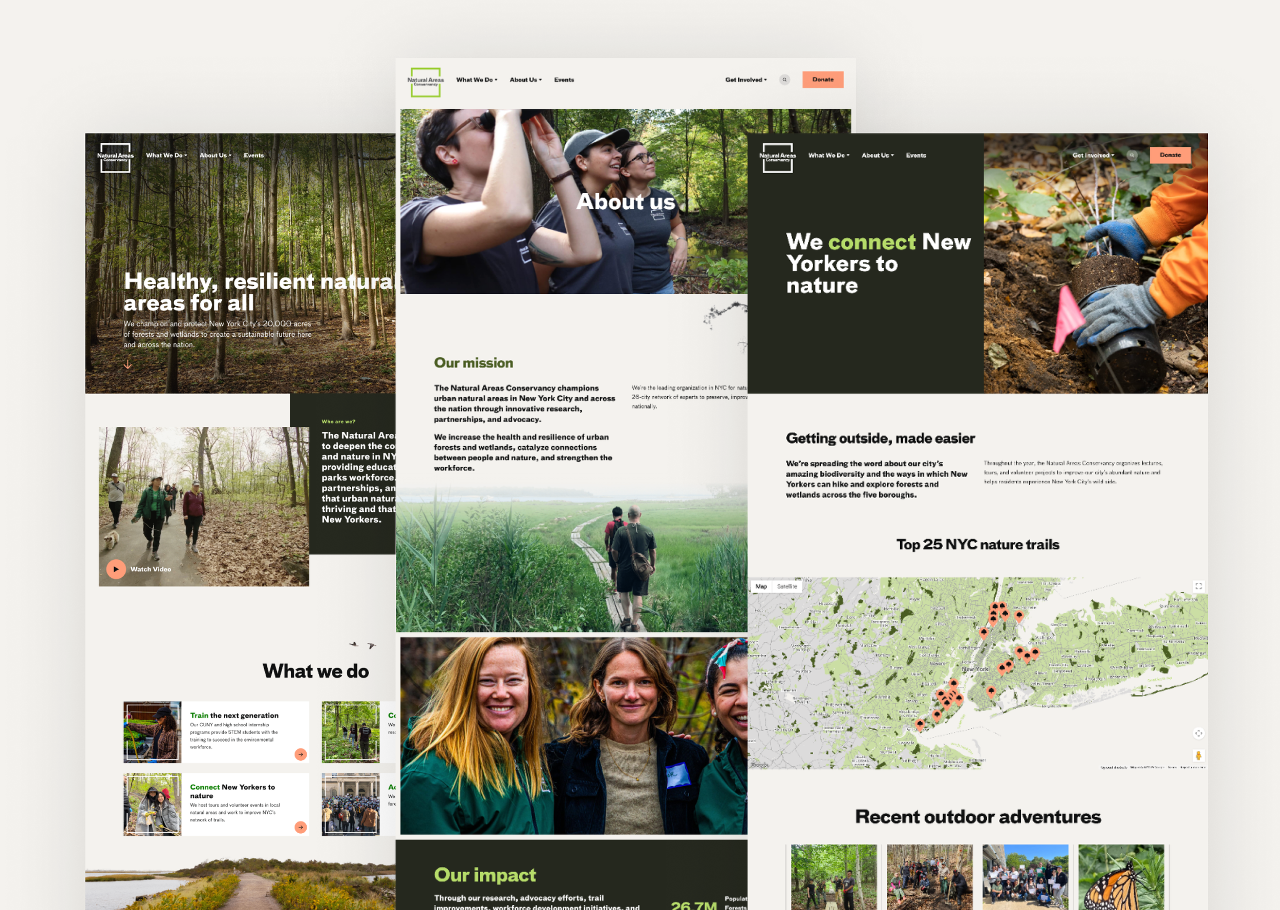 I led this project from a strategy and user experience lens, and worked closely with the visual design team on the overarching concepting and visual directions work. We began the process with discovery, speaking with members of NAC staff across disciplines, from trail maintenance to data management and environmental research. From there I created a brand new site map that took into account all aspects of the site, and integrating in some resources and microsites that the org had been used externally.