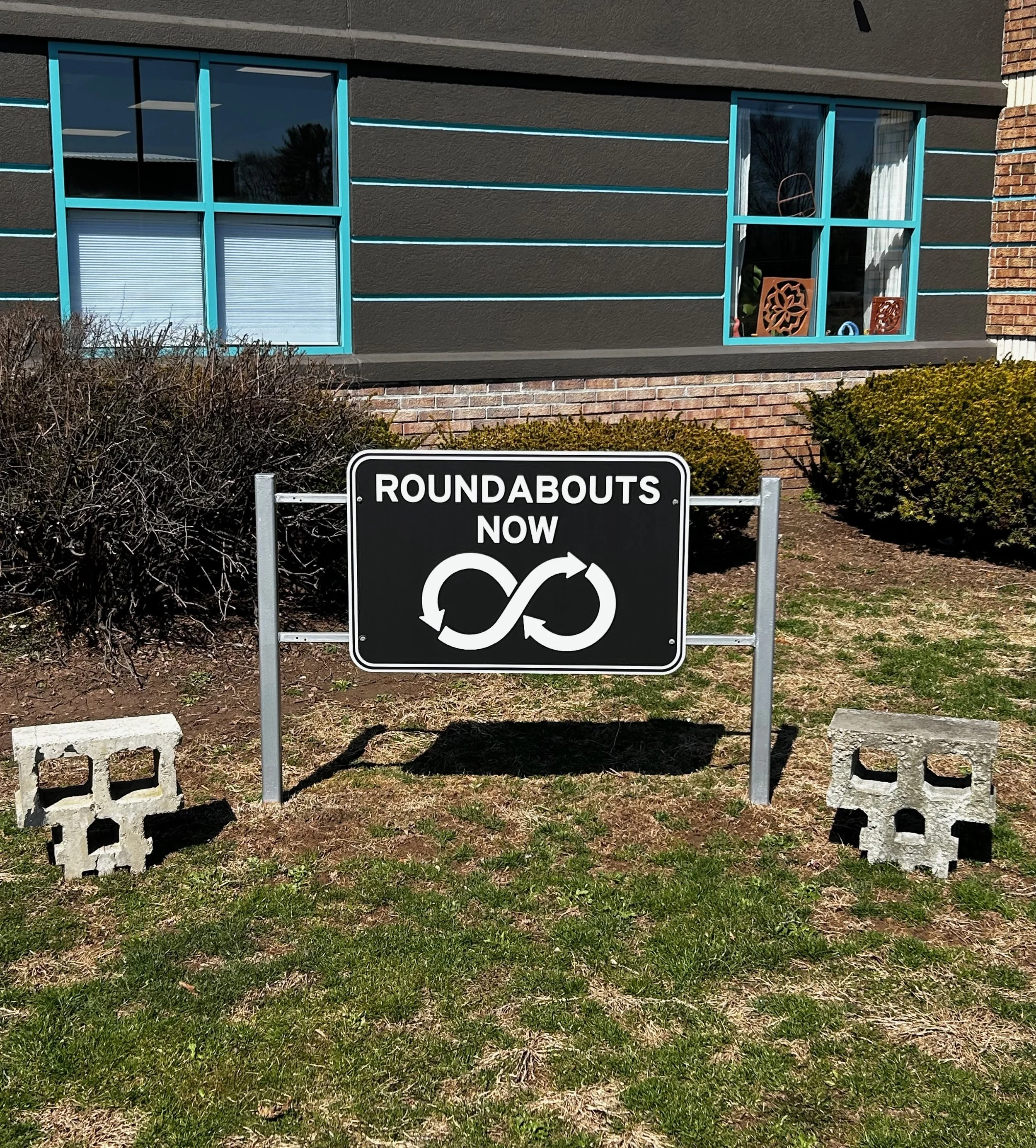 Alta and Craig took the logo and ran with it, creating road-sign-like environmental graphics for the front of the Roundabouts Now building and directional signage for the parking lot and within the halls of the building.
